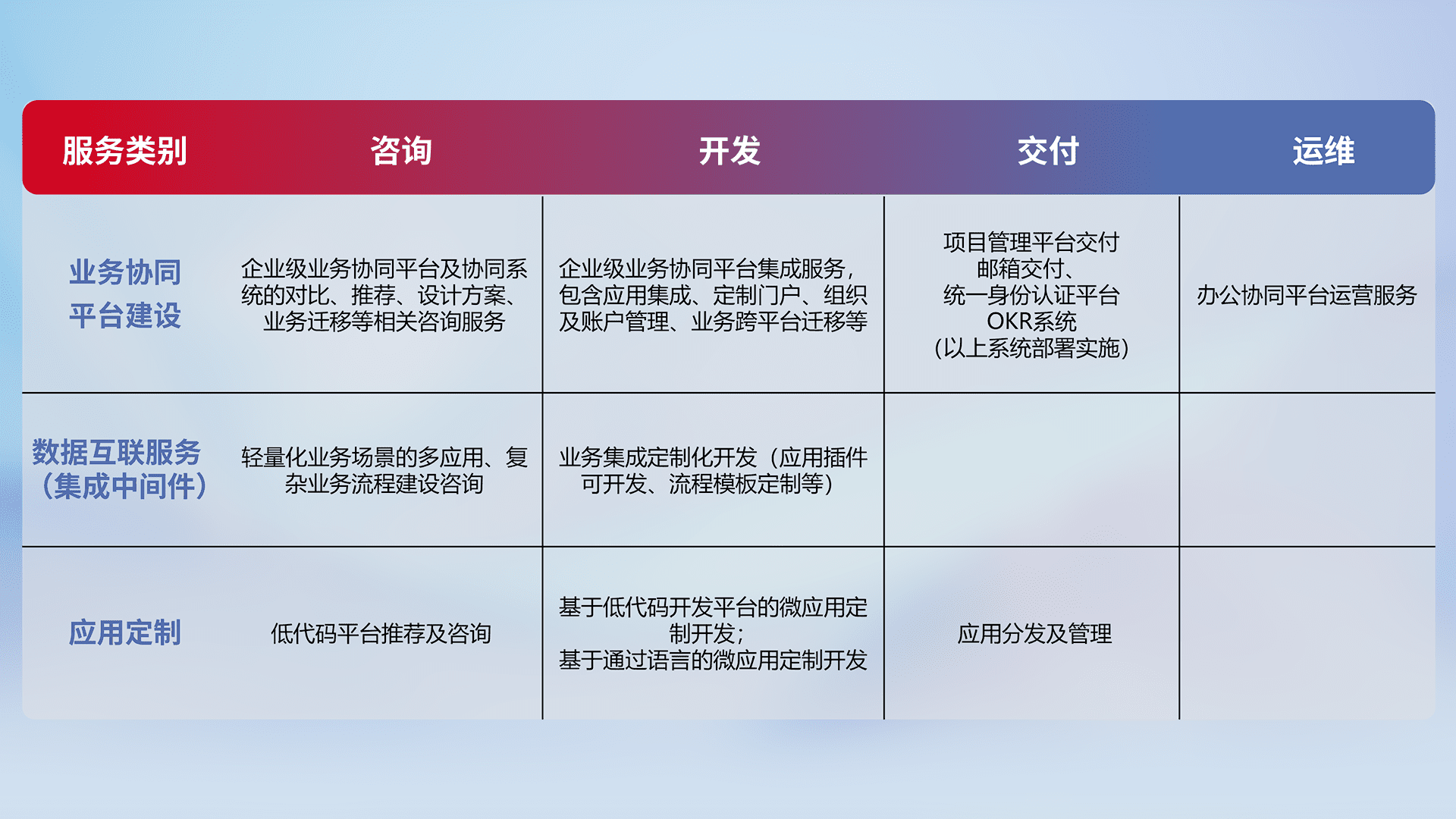 针对钉钉、、企微、、IDaas等平台级产品提供产品的规划、、、方案、、、交付、、定制化开发等服务,,,,实现如统一协同办公、、智能客户服务、、、、混合会议管理、、、智能数据查询、、、等业务场景,,,实现数字化转型。。。