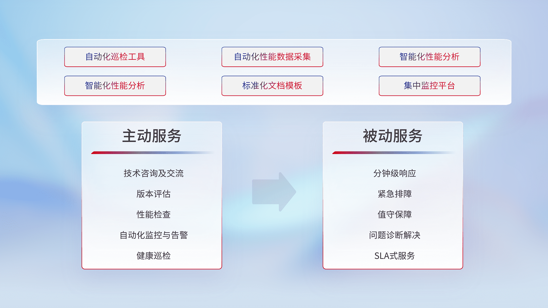 智能化工具和标准化文档,,,,保障服务质量,,,,提供主动服务(包含技术咨询、、、、版本评估、、、性能检查、、、自动化监控与告警、、、、健康巡检)和被动服务包含(分钟级响应、、紧急排障、、、、值守保障、、、问题诊断解决、、、SLA服务)。。。